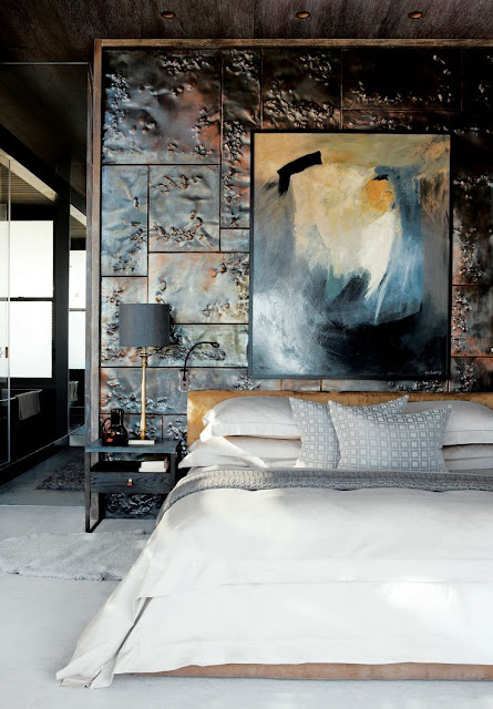 | Custom hammered-copper tiles add texture and reflect light in the master bedroom @lightingworldbay.com #lighting |